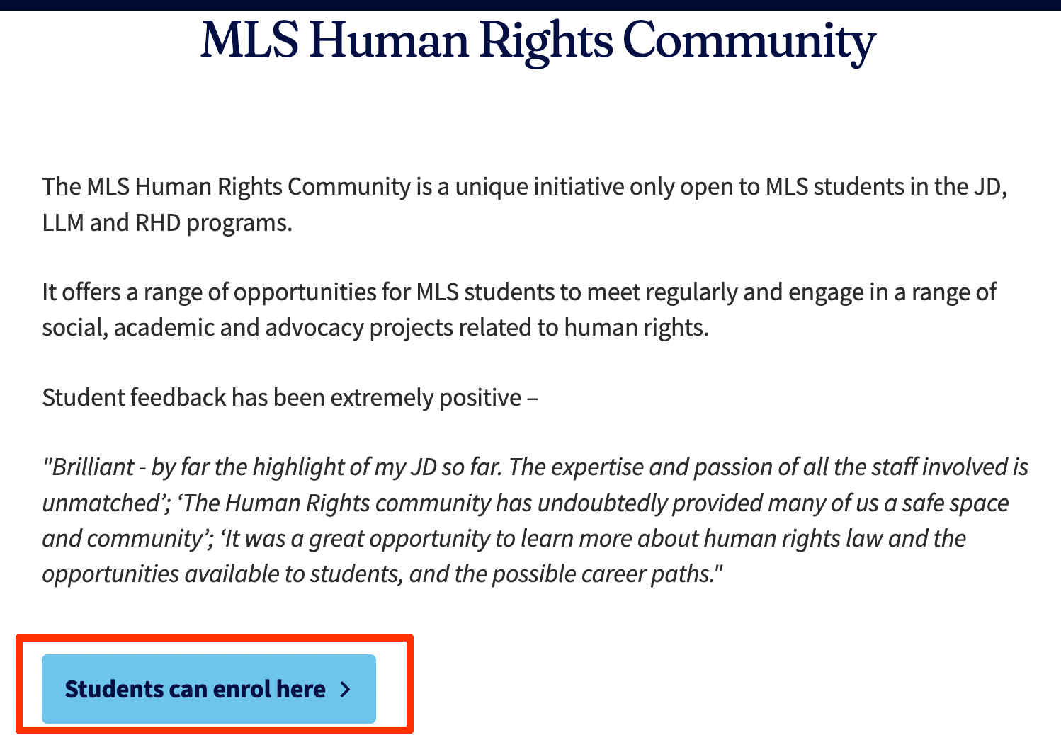 Melbourne Law School offers a range of human rights subjects in its JD and Masters programs. It also offers the breadth subject to students undertaking undergraduate studies at the University of Melbourne.